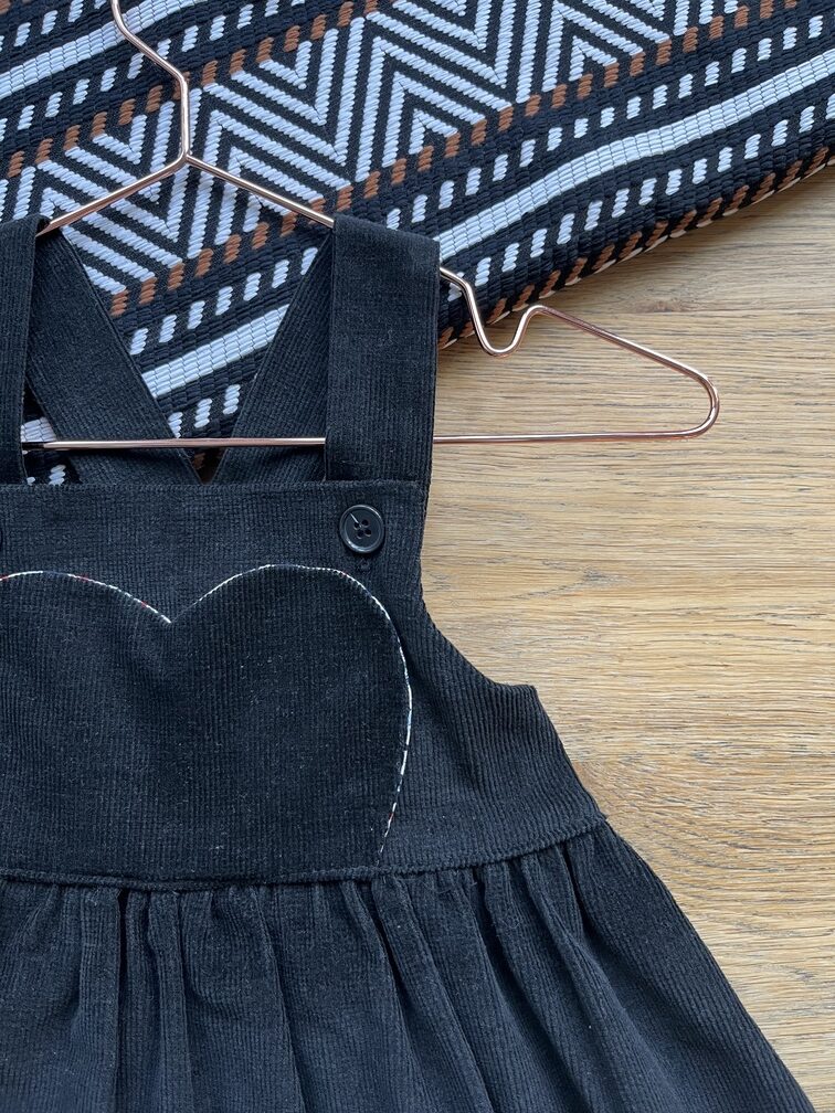 Produit : Robe à bretelle type robe salopette, avec poche cœur sur le devant, taille élastiquée, grand ourlet et bien sûr jupe qui tourne !